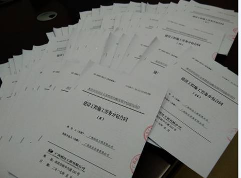 图为与广西恒生劳务有限公司、广西鑫翔劳务有限公司签订劳务分包合同现场