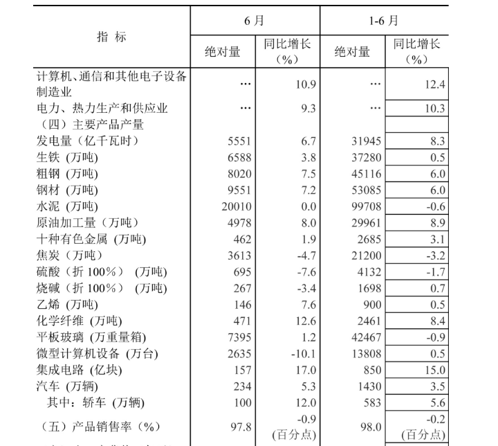 第三产业中,基础设施投资(不含电力、热力、燃气及水生产和供应业)同比增长7.3%,增速比1-5月份回落2.1个百分点。其中,水利管理业投资增长0.4%,增速回落3.5个百分点;公共设施管理业投资增长5.8%,增速回落2.8个百分点;道路运输业投资增长10.9%,增速回落3.9个百分点;铁路运输业投资下降10.3%,降幅收窄1.1个百分点。
