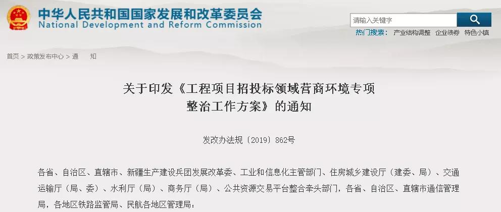 近日,国家发改委、住建部、工信部、交通部、水利部等八部门联合下发通知,决定在全国开展工程项目招投标领域营商环境专项整治。