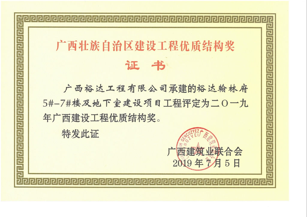 2019年广西建设工程优质结构奖(裕达.翰林府5#-7#楼及地下室建设项目)